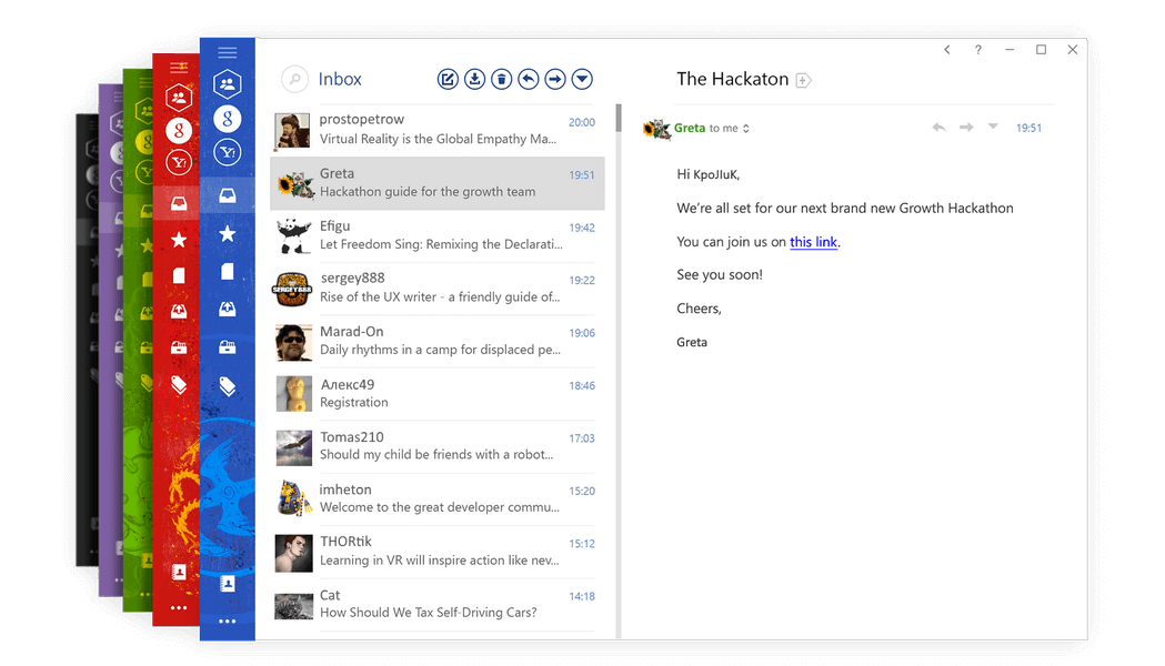 Mailbird — очень интересный почтовый клиент. Простой, удобный и с набором всех необходимых функций. Был создан после закрытия проекта Sparrow и отчасти копирует его простой интерфейс. Цель проекта: создание и дальнейшее развитие быстрого почтового клиента с доступным интерфейсом. В функциональном плане, это простой, но полнофункциональный почтовый клиент: поддержка работы с несколькими почтовыми аккаунтами (до 100 аккаунтов, можно указать известный сервис или POP3/IMAP-сервер почтового провайдера), поиск по письмам и вложениям, система напоминания о письмах (Snooze, как в GMail), уведомления о поступлении новой почты и всякое такое прочее. У Mailbird есть особенность — специальная функция «Приложения», которая, по сути, является набором обычных сайтов интернет-сервисов, которые открываются в окне программы для удобного взаимодействия с почтовым клиентом. Так есть несколько приложений от разработчика, которые добавляют в программу дополнительный функционал (например, менеджер контактов или поиск по вложениям).