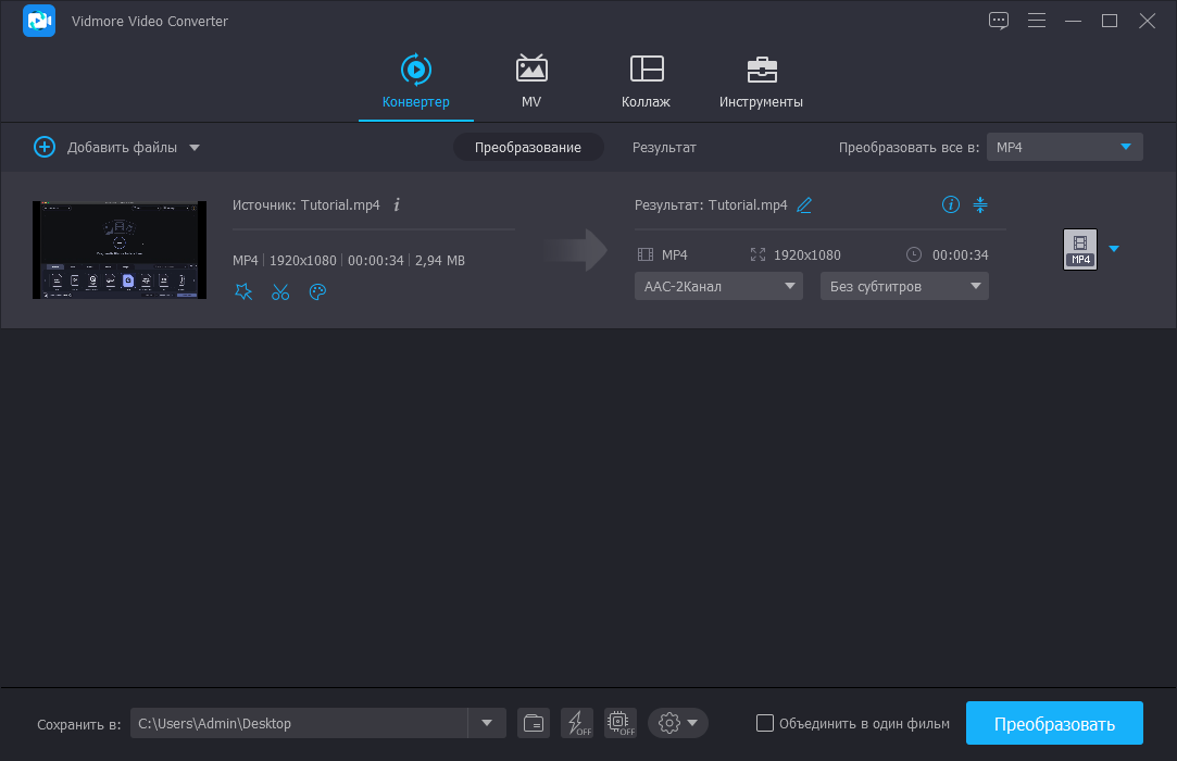 Vidmore Video Converter — программа с хорошо организованным интерфейсом и поддержкой Русского языка, основное предназначение которой, изменить формат нужного видео и тут вам предлагается на выбор один из более чем десятка вариантов с разрешением от 480p до 4K. Есть готовые профили, все они детально настраиваются. Можете просто использовать значения по умолчанию, либо изменить качество видео, настроить кодировщик, указать частоту кадров, указать точные значения битрейта и так далее.