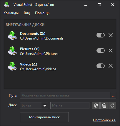 Программа использует API, похожий на утилиту консоли ‘subst’, но упрощает создание и удаление виртуальных дисков в графическом интерфейсе. Используя виртуальные диски, вы можете создавать длинные пути (D:\User\Test\Documents\Projects\) в одной букве диска (X:).