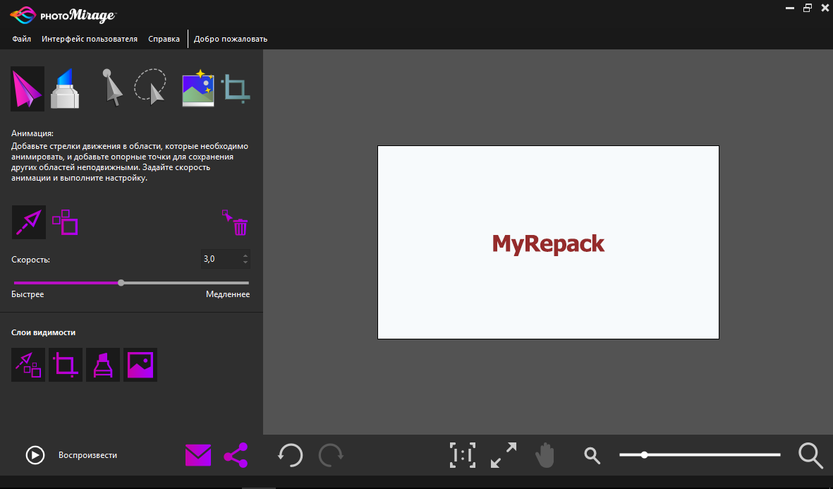 Изображения с эффектами вращения, скручивания и перетекания размывают границу между фото и видео. Замечательные инструменты PhotoMirage позволяют буквально за несколько минут без труда превратить любое изображение в завораживающую анимацию. Перетащите стрелки движения в направлении применения эффекта и установите опорные точки вокруг тех областей изображения, которые должны оставаться статичными. Оцените эффект при помощи превью и наслаждайтесь ожившими фотографиями! Независимо от преследуемой цели, будь то повышение уровня вовлеченности в социальных сетях, стимуляция результативности работы в интернете или просто приятное времяпрепровождение, PhotoMirage — ваш ключ к созданию восхитительных анимированных фотографий, которые очаровывают и пленяют.