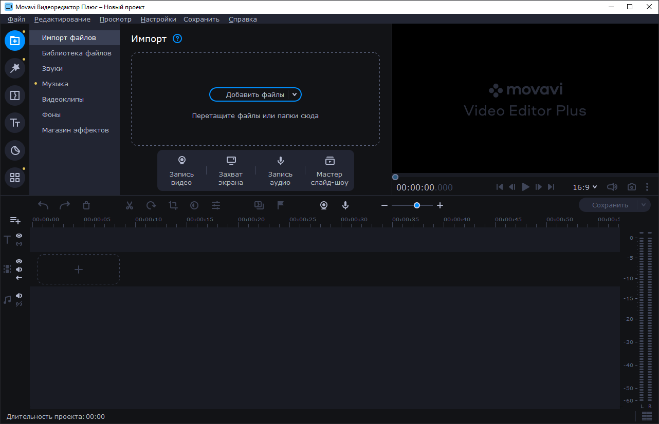 Movavi Video Editor позволит вам захватить видео и звук, а после добавить результат в ваш проект, может работать с камерами, телевизорами, видеомагнитофонами. При желании вы сможете создать красивое слайд-шоу из ваших изображений. После того как проект будет готов, его можно сохранить в одном из поддерживаемых форматов, а можно записать на носитель или импортировать в файл для просмотра на разных устройствах.