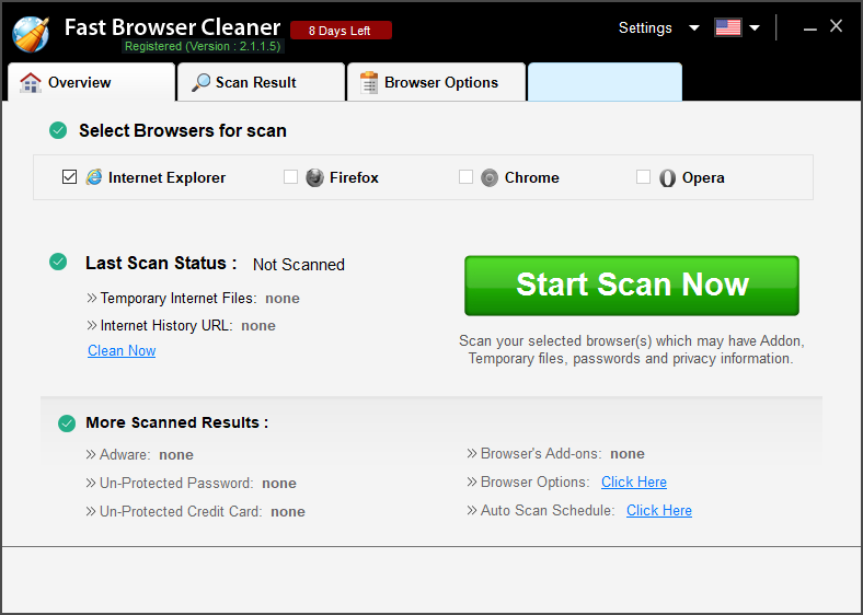 Fast Browser Cleaner — это утилита для очистки ненужных панелей инструментов, надстроек и расширений в браузерах. Программа поможет очистить файлы cookie, историю и временные файлы. Вы также можете удалить незащищенные пароли и информацию о кредитной карте, хранящиеся в браузере, который вы использовали для входа на определенные веб-сайты или совершения платежей.