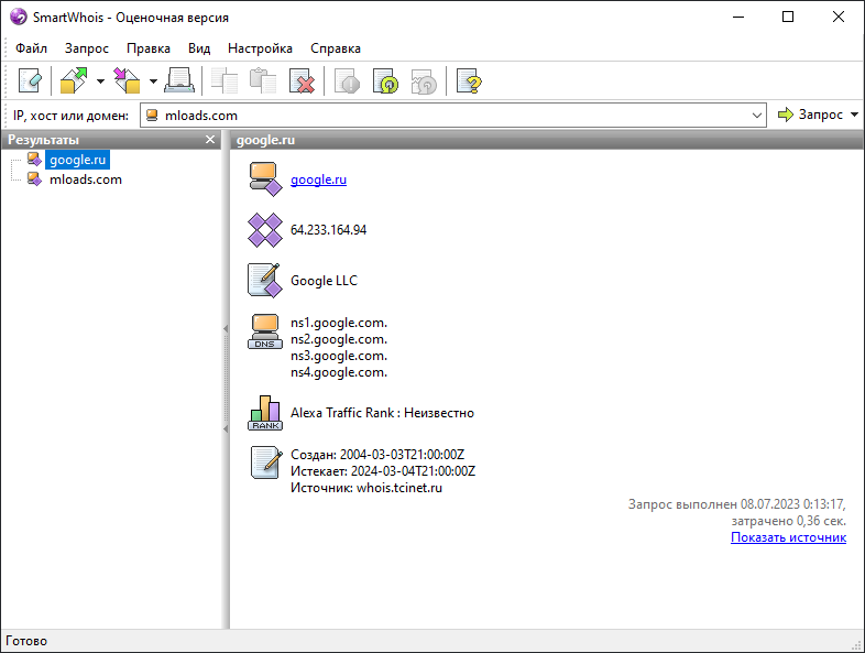 • Интеграция с Microsoft Internet Explorer и Microsoft Outlook. Быстрый поиск владельца домена и IP-адреса в заголовках сообщений электронной почты.