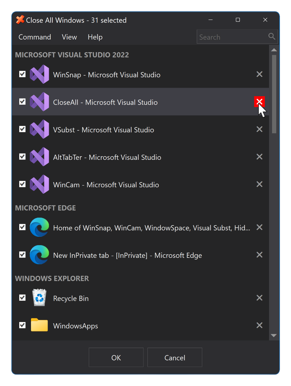 Вы можете выбрать несколько приложений, щелкнув их в списке, а затем нажать кнопку ОК, чтобы закрыть выбранные приложения, или использовать отдельные кнопки закрытия, чтобы закрыть приложения по одному.