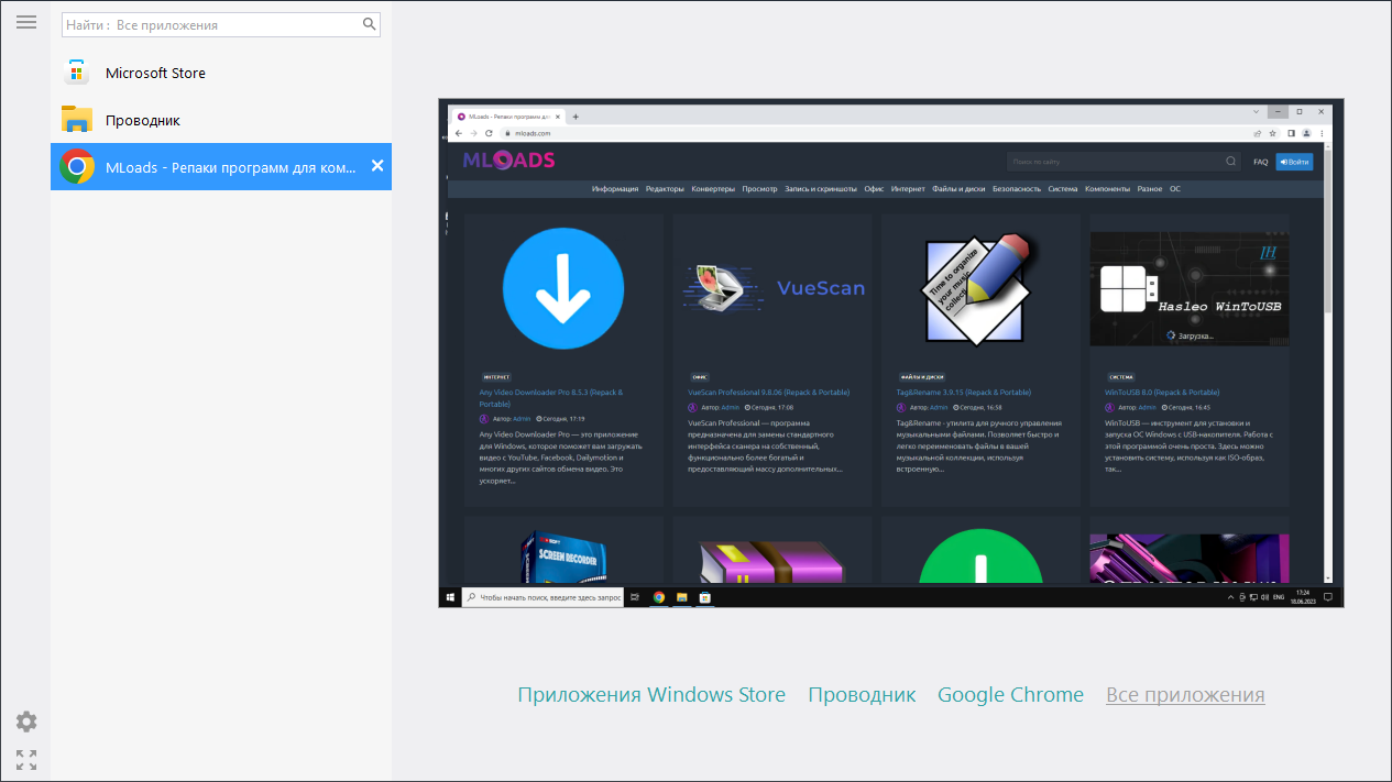 Программа может вызываться кликом по иконке в системном трее, нажатием системных горячих клавиш Alt+Tab, Win+Tab или заданных пользователем в настройках. Переключаться между задачами можно как при помощи клавиш навигации клавиатуры, так и мышью. Также как системное диалоговое окно, Alt-Tab Terminator умеет показывать миниатюры (скриншоты) запущенных программ.