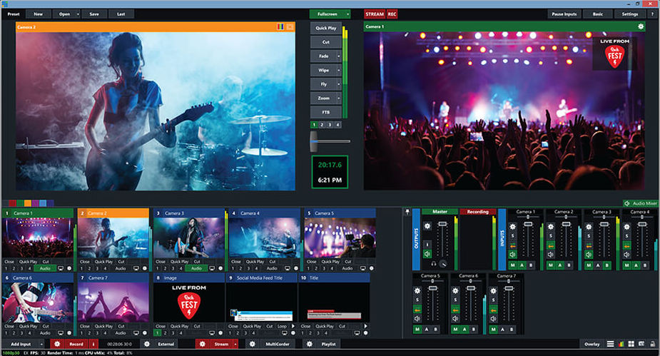 vMix Pro — эту программу можно смело отнести к самым современным видеомикшерам выпущенным на сегодняшний день. Теперь не прилагая большие усилия (обратите внимание на слово «большие», а то когда так пишу, все думают, что сразу ничего делать вообще не надо), можно компоновать видео любого разрешения вплоть до самых высоких, при этом использовать для этого можно разные источники, а после результат отдается как по видео так и по IP каналам.